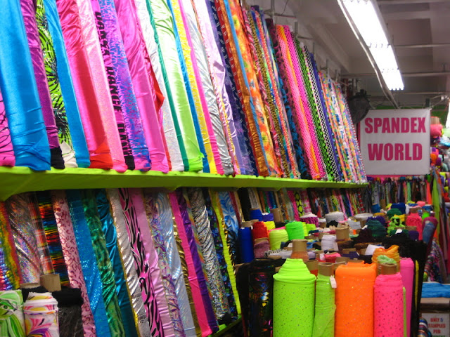 Probably my favorite thing I've done while my boys are away is that I went to the Fashion District, finally. I had specific fabric colors and types in mind and I wanted specific trims too. I knew I would be tempted with all of the options in all of the stores so I was glad when I was a very focused shopper. I ended up getting great deals, too. And while I didn't go shopping for neons, spandex, or sequins like you see above, I did enjoy all of it and more on my adventure.